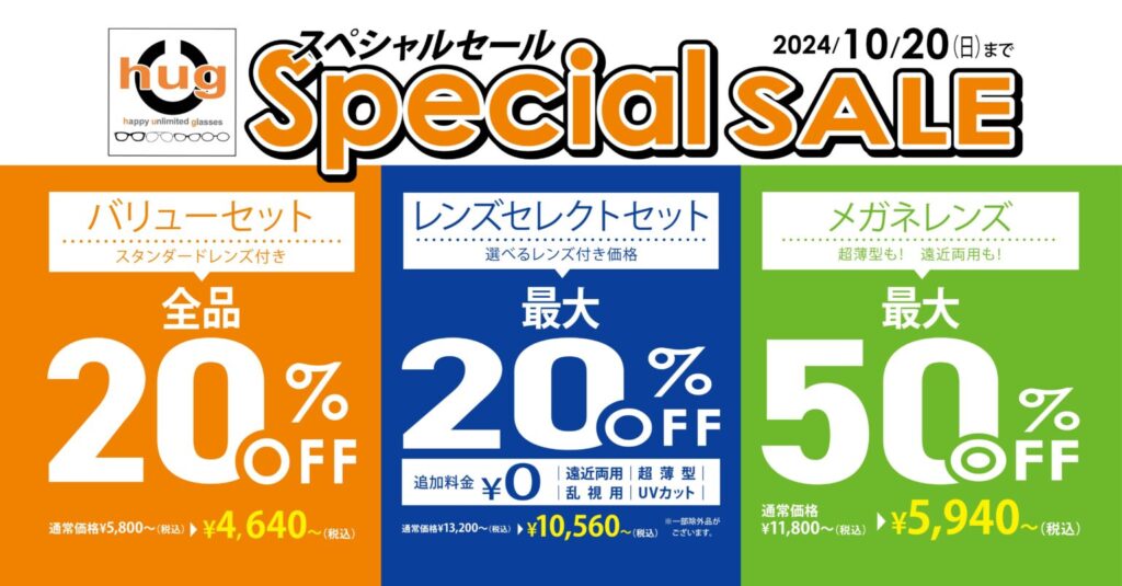 2024年10月20日まで開催中!hugはメガネ全品レンズ込み価格【バリューセッ