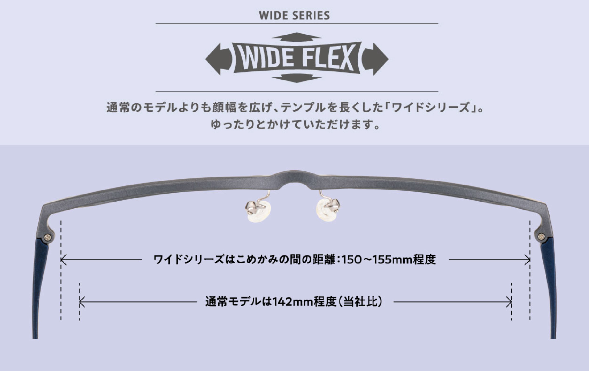 通常のモデルよりも顔幅を広げ、テンプルを長くしたゆったりとかけていいただけるシリーズです。
