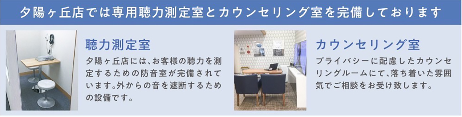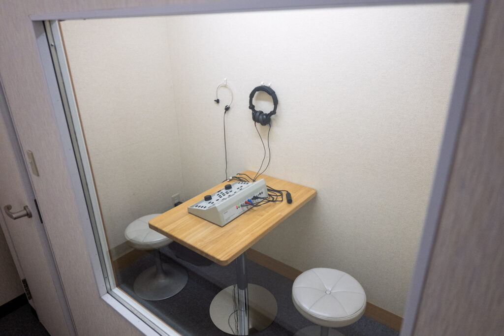 夕陽ヶ丘店には、お客様の聴力を測定するための防音室が完備されています。外からの音を遮断するための設備です。