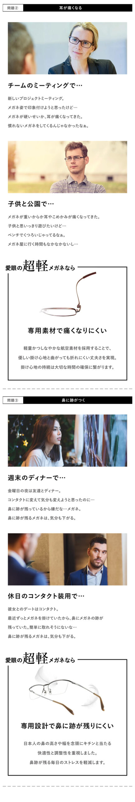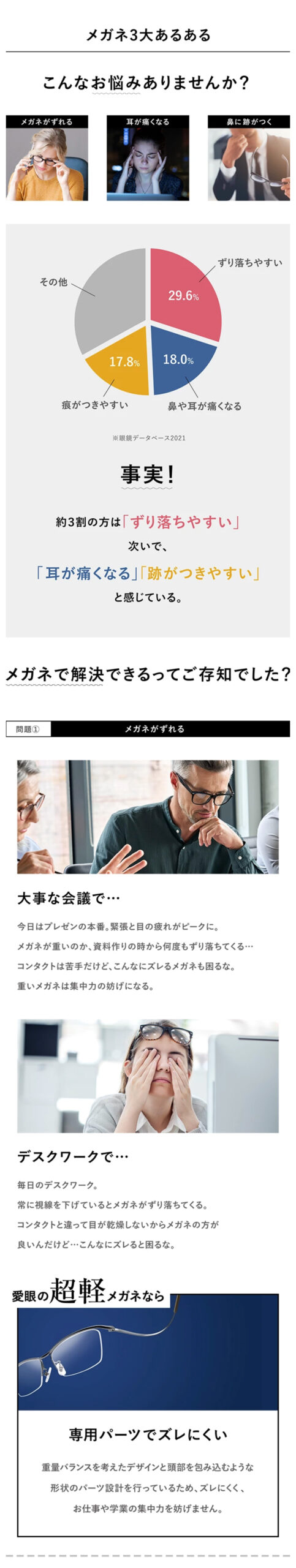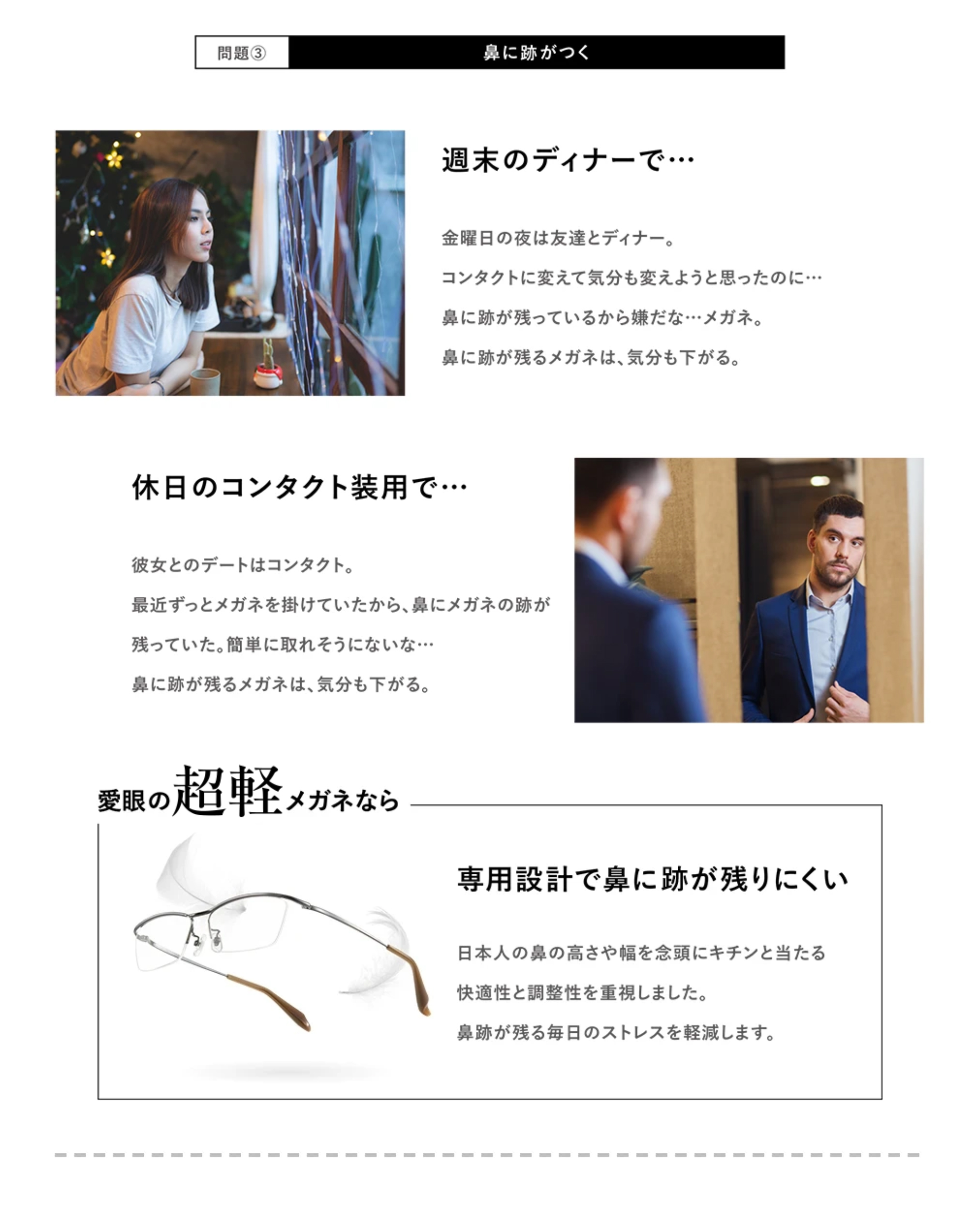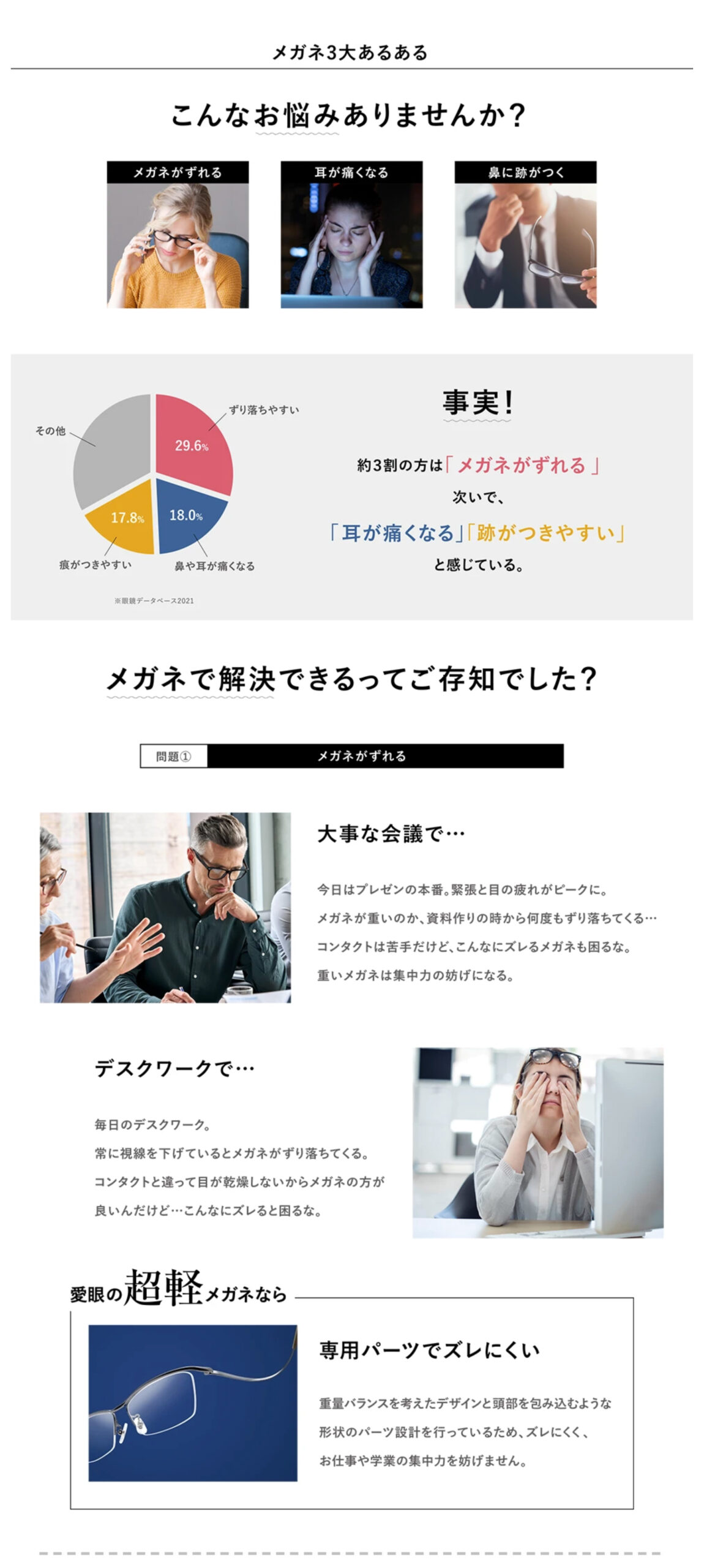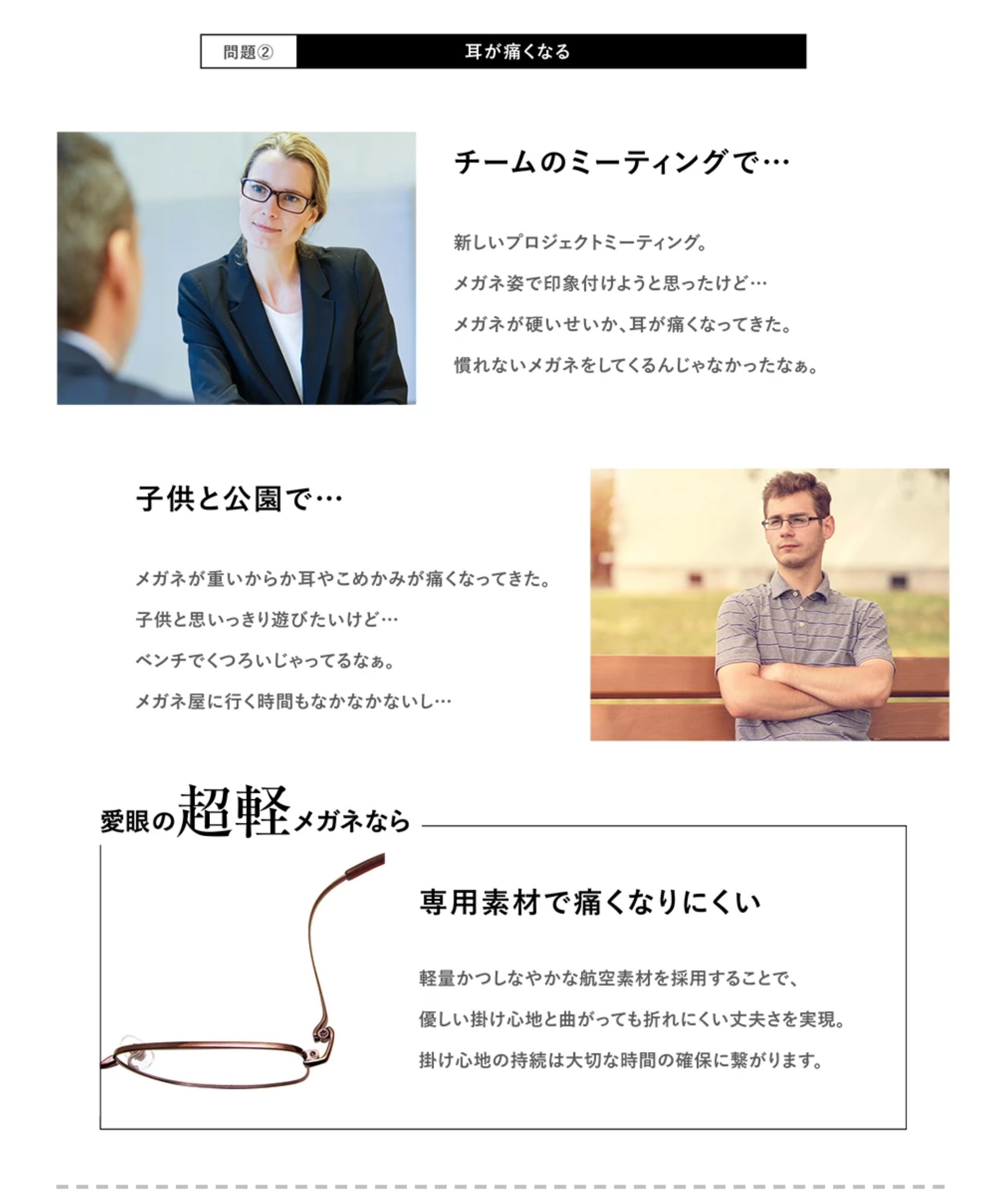「smart fit」とは、「メガネがずれる」「メガネの長時間使用で耳が痛い」「メガネをかけると鼻に跡がつく」などの悩みに寄り添ったメガネです。