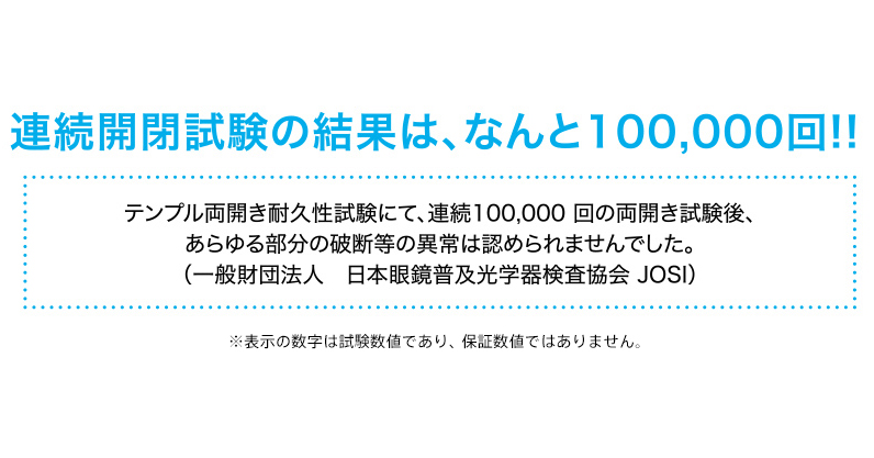 両開き試験にて、連続10万回の両開きをクリア。●メガネが初めての学生に●掛け外しが多い方に●コンタクトレンズを併用する方に●仕事、家事、育児に